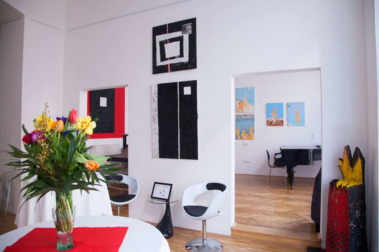 Das Gran-Opening: 7. und 8. März 2014. Endlich erstrahlte unser klassizistisch-sezessionistisches Traumobjekt dank modernster LED-Technologie in vollster Pracht. Unsere Eröffnungsausstellung "Aufbruch & neue Wege" mit Hanna Scheriau, Eva Pisa, Renate Polzer und Colbert Nourrice zeigt bis Ende März eine aktuelle Leistungsschau der Künstler, die bei BURN-IN  unter Vertrag stehen. Über 70 Besucher genossen die sehr eigenständigen Arbeiten und labten sich bei einem Strukturenbuffet, das als kulinarisches Synonym für unsere Arbeit diente.