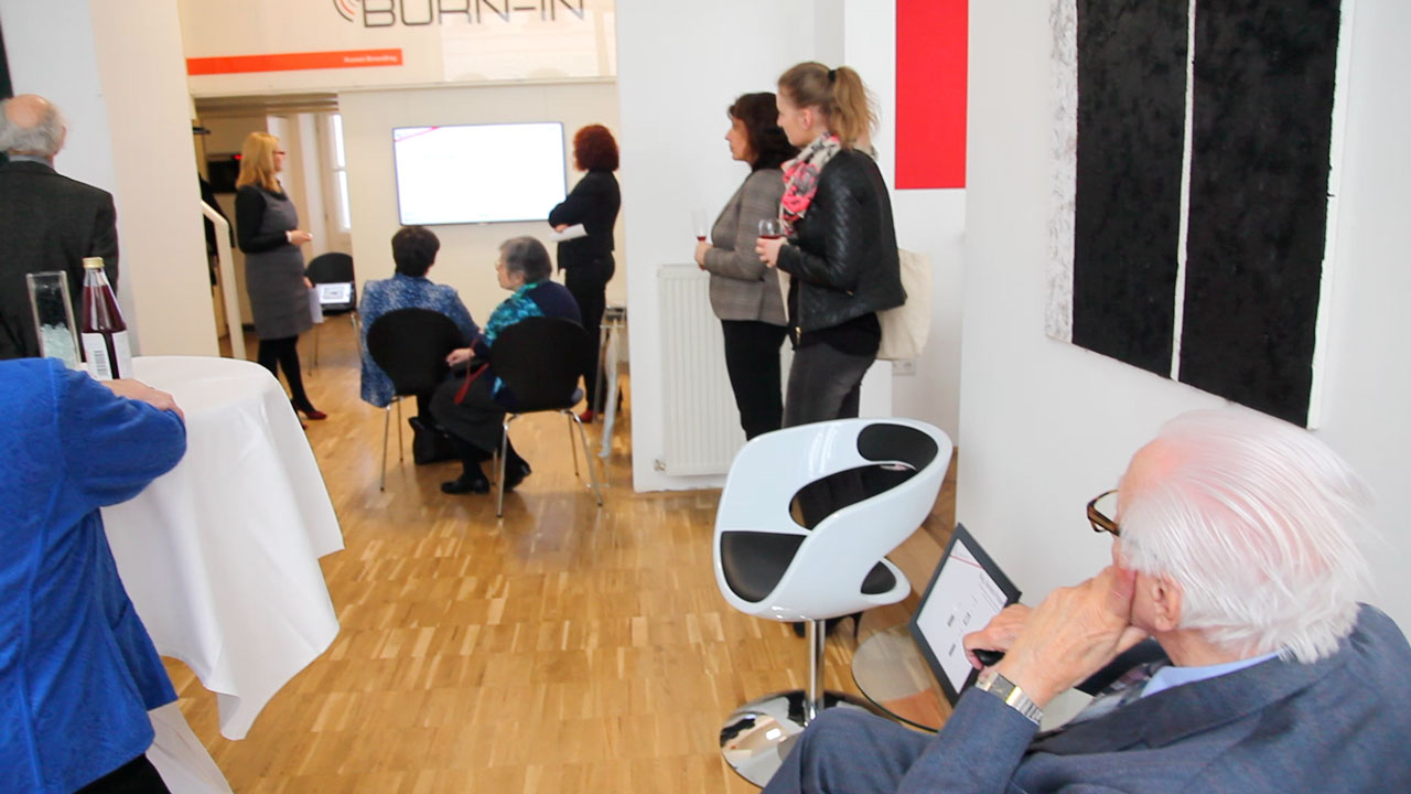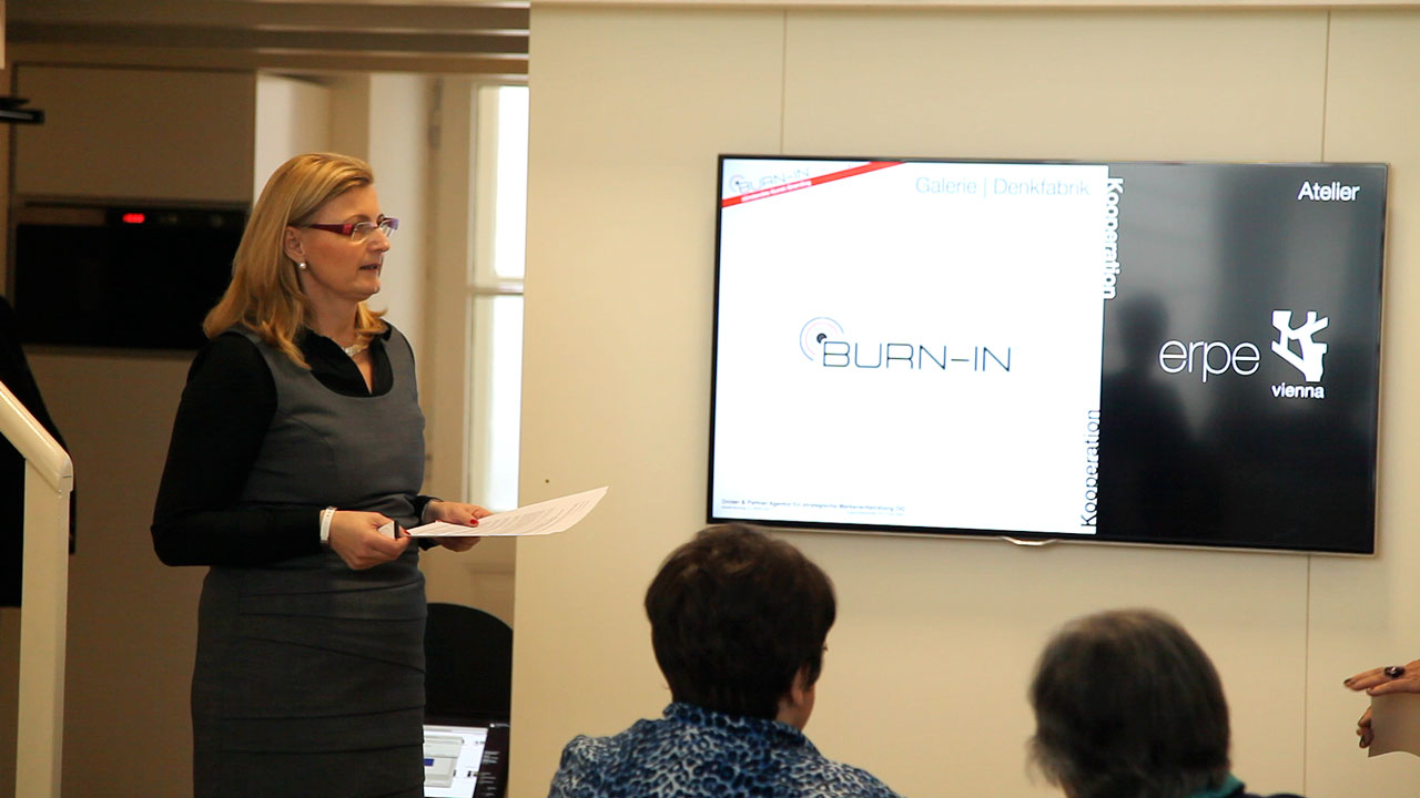 Im Anschluss lieferte Renate Polzer einen sehr persönlichen Erfahrungsbericht aus Künstlersicht. Sie sprach über ihre mehrjährige Zusammenarbeit, ihre Erfahrungen und Erfolge mit BURN-IN und erörterte ihre Beweggründe der Kooperation ihres Ateliers erpe mit der Plattform BURN-IN. Die anschließende Diskussion und weiterführende persönliche Gespräche  sorgten für einen schönen Ausklang des Events.