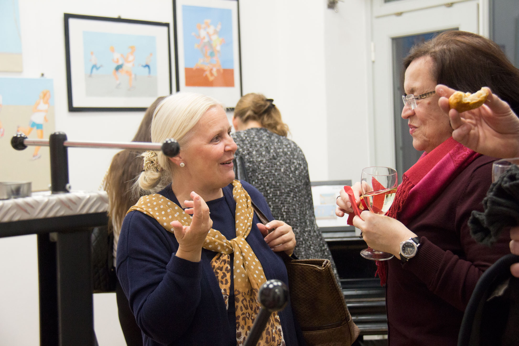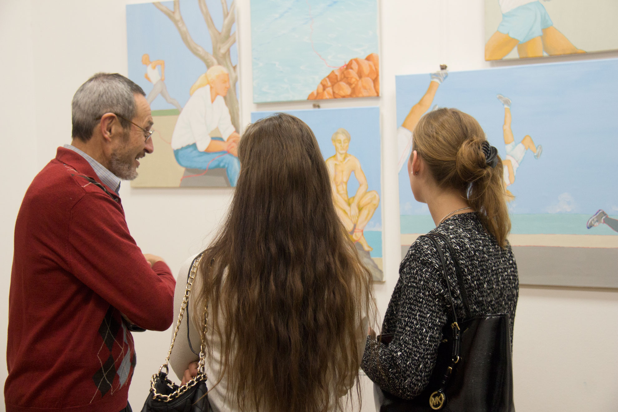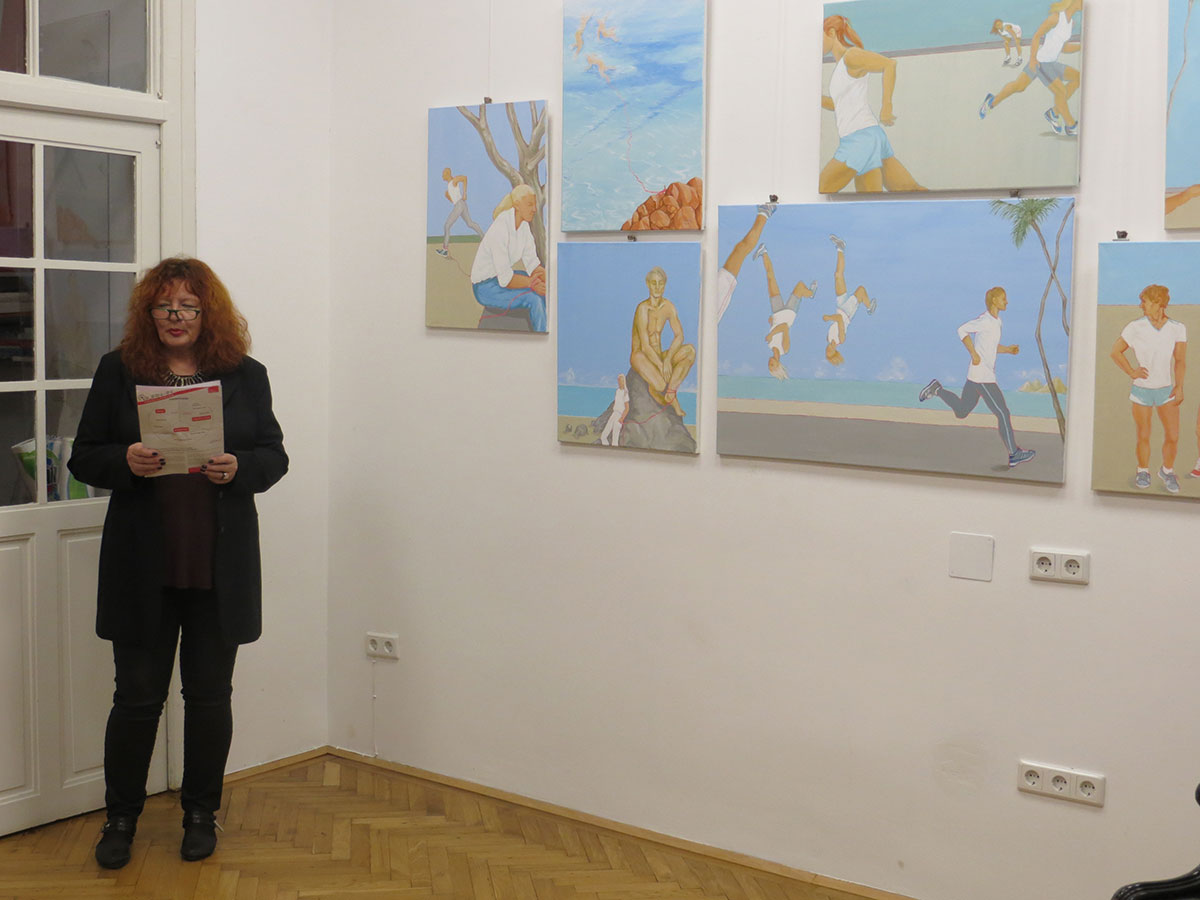 Das Thema des roten Ariadne-Fadens verbindet Eva Pisa mit den sportlichen Bewegungs-Bildern. Im Kontrast zur fotorealistischen Darstellung der Figuren geht es in Pisas Bildern vor allem um die Welt des Unbewussten, um eine philosophische Deutung des Dargestellten. Die Menschen stehen, obwohl sie oft weit entfernt von einander sind, im Dialog, an einen Faden gebunden und sowohl in den Faden wie auch ineinander verstrickt. Ausgehend von der realistischen Menschendarstellung bildet die Künstlerin in Ihrer Malerei eine Brücke zu einem halluzinatorischen Blick auf abgelöste Körperteile in surrealistischem Stil, die oft frei in den Lüften schweben – in Bewegung und Stillstand zugleich.