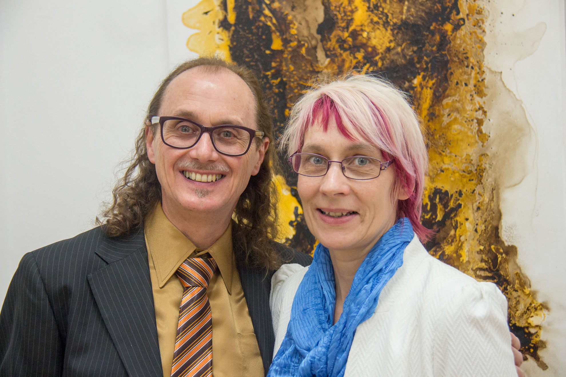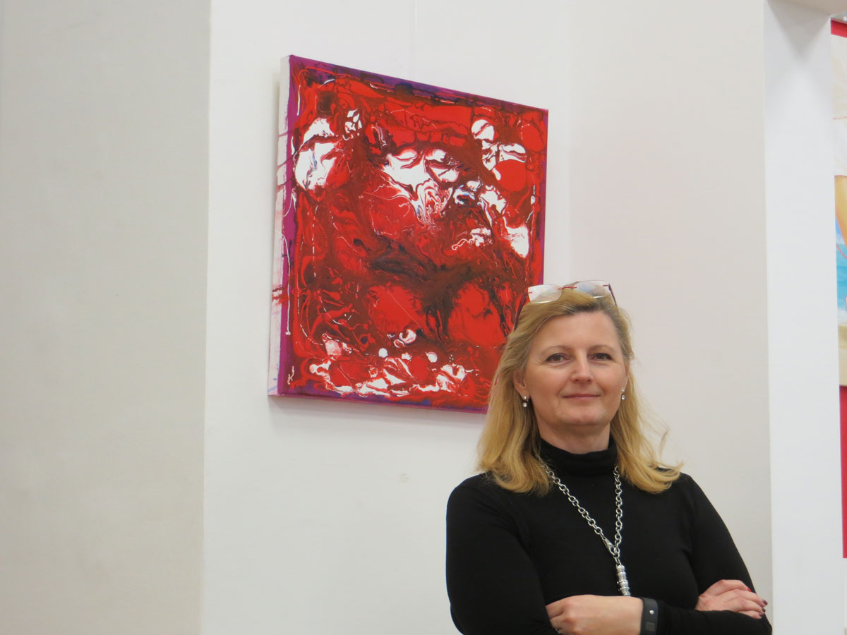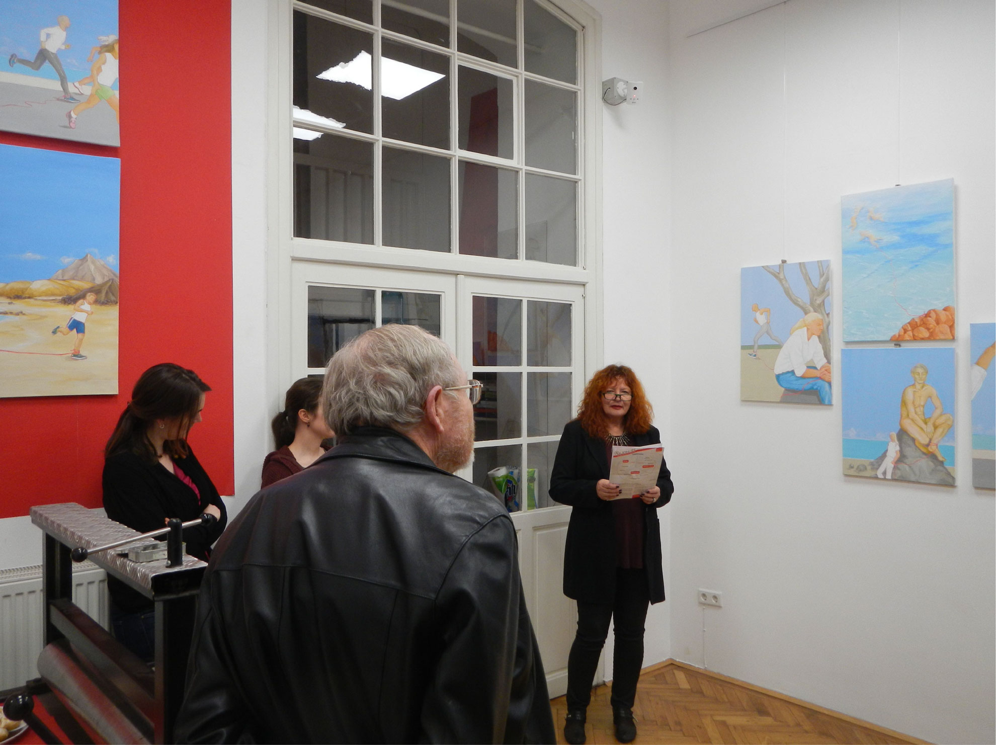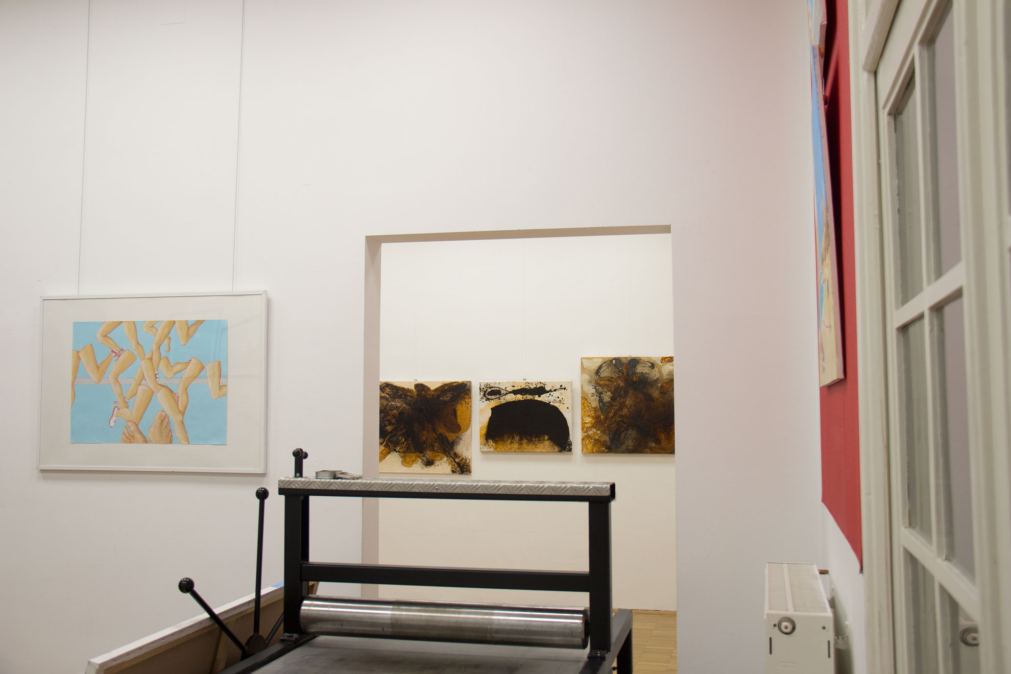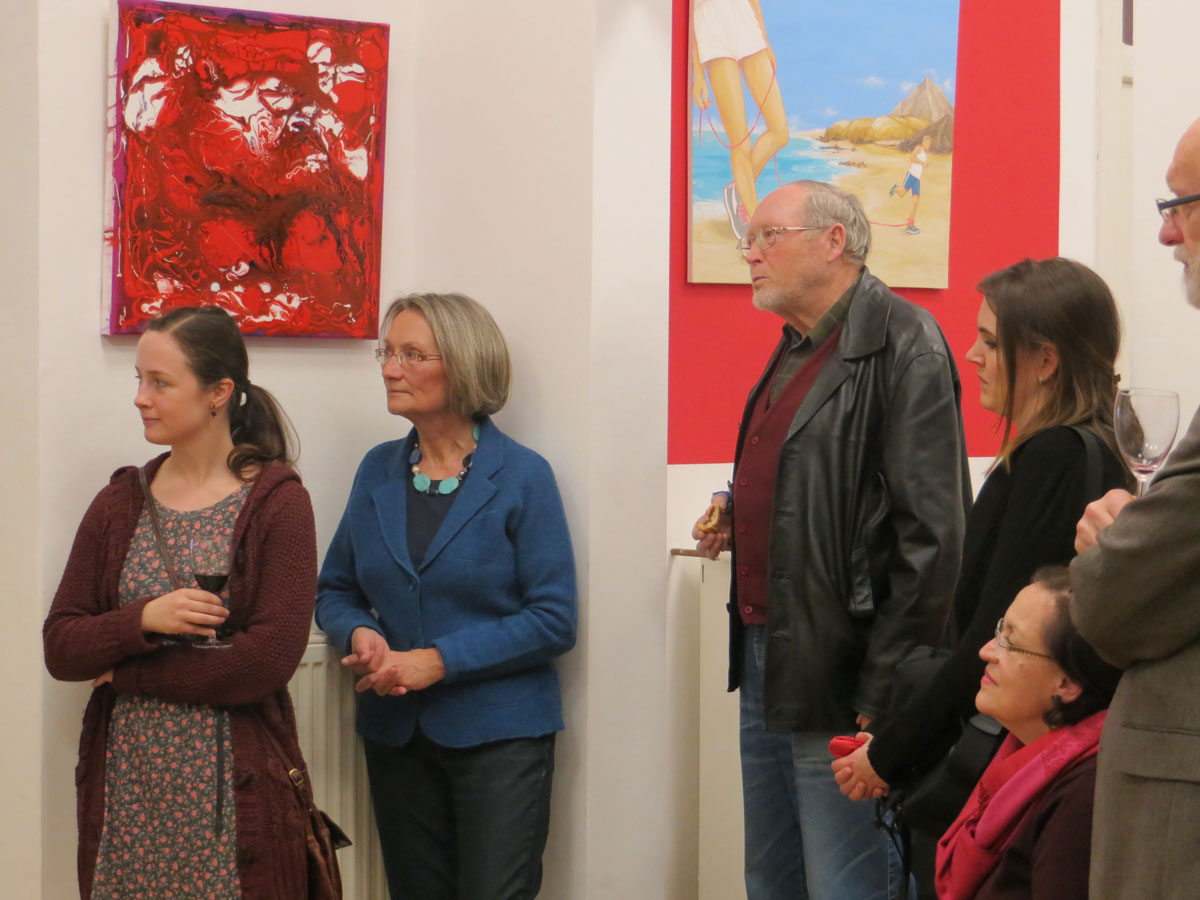 Eva Pisa (A) und Franz Bucher (CH) präsentieren in dieser Ausstellung verschiedene Aspekte von Bewegung und Stillstand. In den Arbeiten Eva Pisas geht es auf den ersten Blick um sportliche Bewegung und um die Verbindungen mit dem roten Faden, unserem Galerien-Jahresthema. Franz Buchers Zugang zum Thema ist ein arbeitstechnischer, der mit den Bewegungen seiner Malmaterialien zusammenhängt, von ihm zwar gesteuert wird, aber doch dem Fließen und Stillstand der Farben unterliegt.