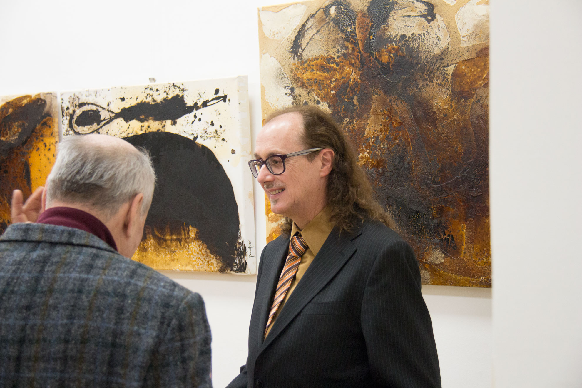 Die Themen der Arbeiten Franz Buchers setzen sich in rein abstrakter Malweise mit dem Hier und Heute und mit dem Menschen an sich auseinander. Er entwickelt seine Bilder aus explosionsartigen Formen aus Bitumen und Schellack. Helle vielschichtige Gebilde wachsen aus diesem Mittelpunkt heraus. Die Endfassung entsteht durch bewusstes Navigieren der Leinwand, wodurch sich die dramatischen dunklen Stellen mit den hellen Farben mischen und sich zu verschlungenen Strukturen verbinden. Die Arbeitsweise Buchers entspricht auch dem Thema der Ausstellung „Bewegung.Stillstand“. Bitumen und Lacke bewegen sich, fließen ineinander über und kommen erst nach dem Trocknen zum Stillstand.