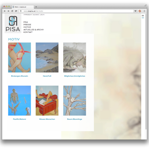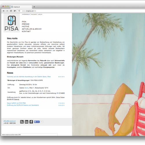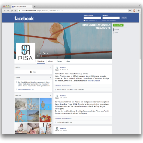 Seit Anfang 2014 vertreten wir die Künstlerin Mag. Eva Pisa in unserer zeitgenössischen BURN-IN Galerie. Pisa lebt in NÖ und einige Monate im Jahr in Hawaii. Silberne Fügermedaille der Akademie, goldenes Verdienstzeichen der Republik, über 80 Ausstellungen weltweit, Wettbewerbsausstellungen, Kunstmessen, Künstlersymposien; Mitarbeit bei Kulturprojekten.