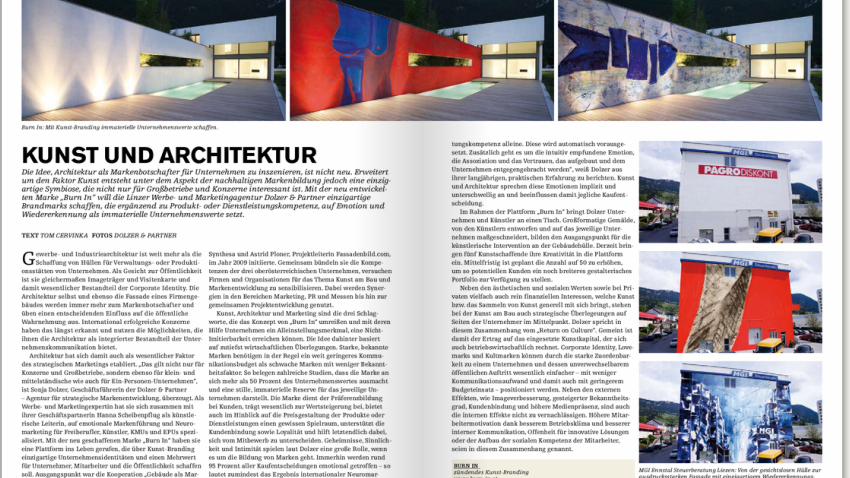 Die Idee, Architektur als Markenbotschafter für Unternehmen zu inszenieren, ist nicht neu. Erweitert um den Faktor Kunst entsteht unter dem Aspekt der nachhaltigen Markenbildung jedoch eine einzigartige Symbiose, die nicht für für Großbetriebe und Konzerne interessant ist. Mit der neu entwickelten Marke "BURN-IN" will die Linzer Werbe- und Marketingagentur Dolzer & Partner einzigartige Brandmarks schaffen, die ergänzend zu Produkt- und Dienstleistungskompetenz, auf Emotion und Wiedererkennung als immaterielle Unternehmenswerte setzt.