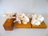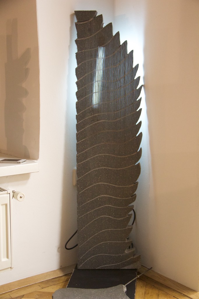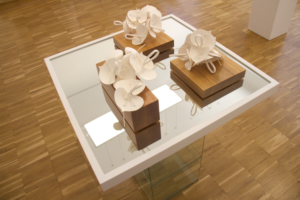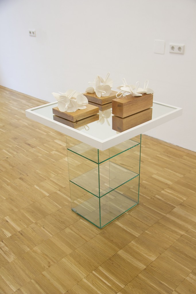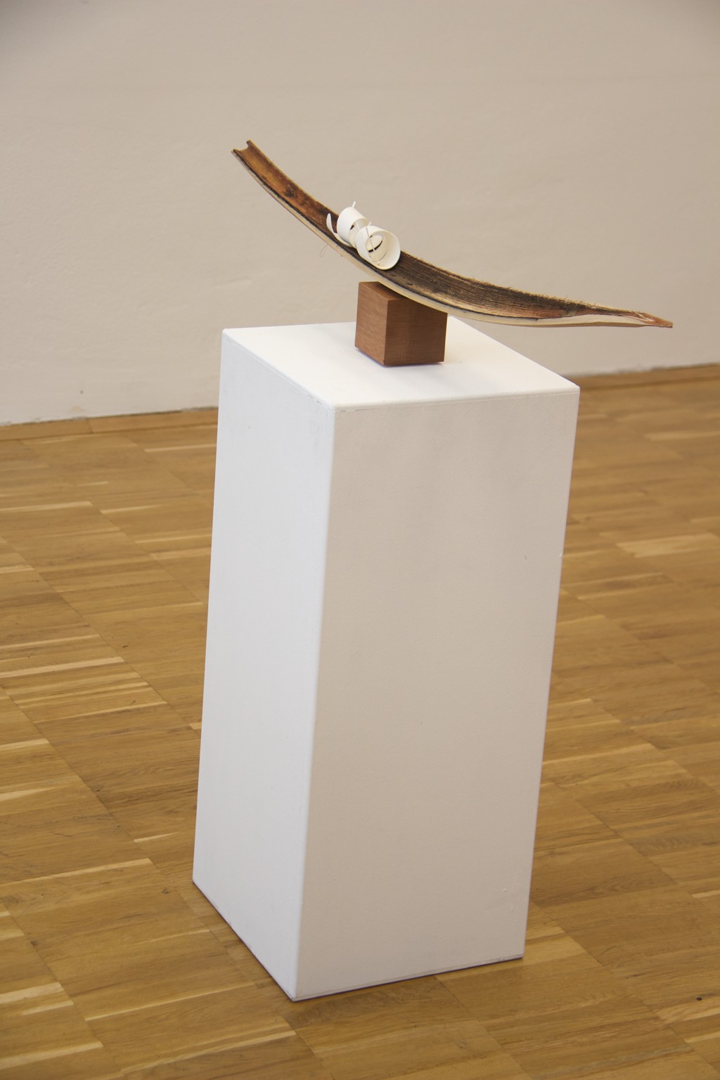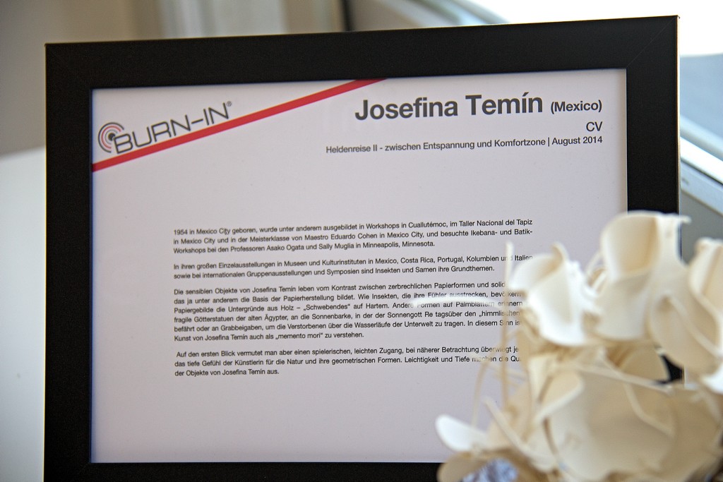 Die sensiblen Objekte von Josefina Temín leben vom Kontrast zwischen zerbrechlichen Papierformen und solidem Holz, das ja unter anderem die Basis der Papierherstellung bildet. Wie Insekten, die ihre Fühler ausstrecken, bevölkern die Papiergebilde die Untergründe aus Holz – „ Schwebendes“ auf Hartem. Andere Formen auf Palmblättern erinnern an fragile Götterstatuen der alten Ägypter, an die Sonnenbarke, in der der Sonnengott Re tagsüber den „himmlischen“ Nil befährt oder an Grabbeigaben, um die Verstorbenen über die Wasserläufe der Unterwelt zu tragen. In diesem Sinn ist die Kunst von Josefina Temin auch als „memento mori“ zu verstehen.