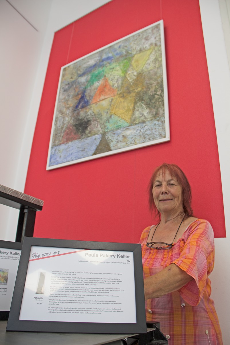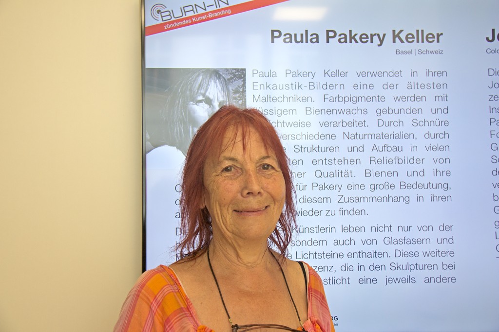 Paula Pakery-Keller verwendet in ihren Enkaustik-Bildern eine der ältesten Maltechniken. Farbpigmente werden mit flüssigem Bienenwachs gebunden und schichtweise verarbeitet. Durch Schnüre und verschiedene Naturmaterialien, durch geritzte Strukturen und Aufbau in vielen Schichten entstehen Reliefbilder von haptischer Qualität.
