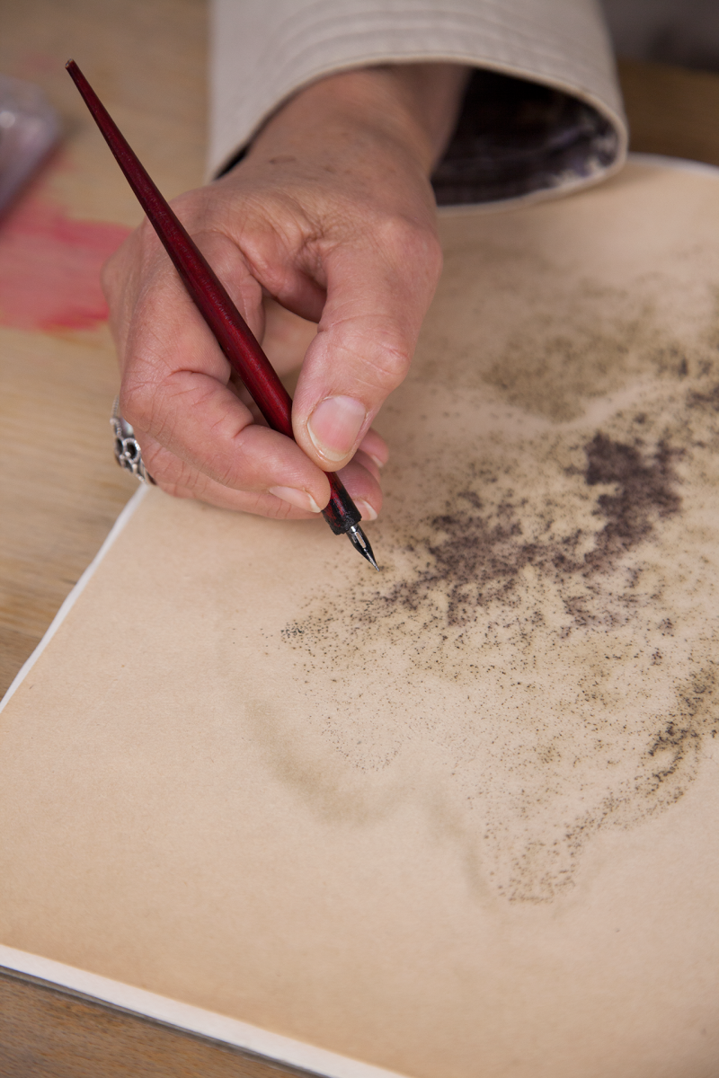 Schrittweise machten sich diese in den satirischen Zeichnungen breit, in einer ganz speziellen Technik, die aus mehreren Schichten besteht und mit Feder und Tusche auf präpariertem Papier gezeichnet werden.