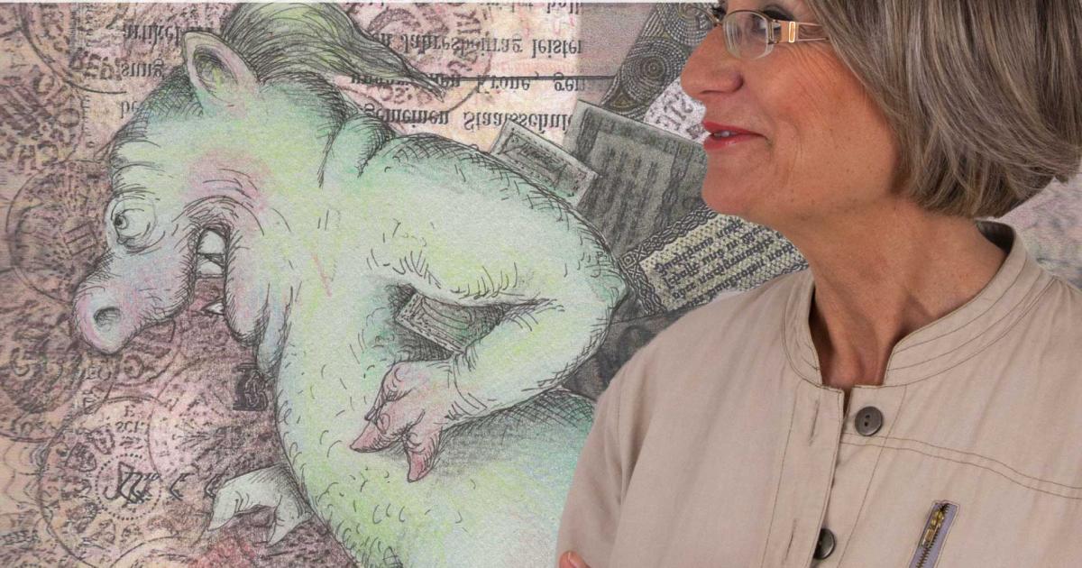 Beim Stöbern in alten Papieren, Zertifikaten, Geldscheinen, tauchten bei Eva Pisa allerhand eigenartige Gestalten auf…. der Gulden Gnom, der Wertpapier Wächter, der Banknoten Bilch… ein Münzensammler.