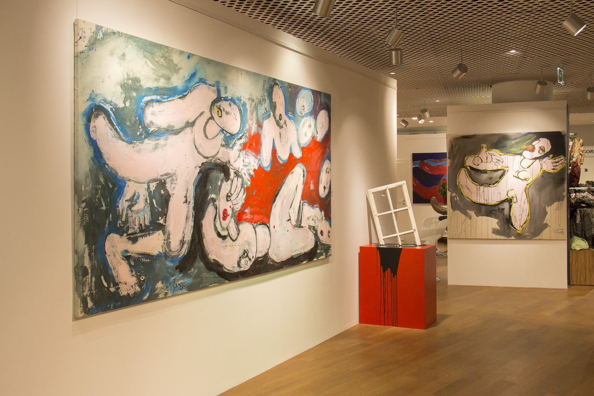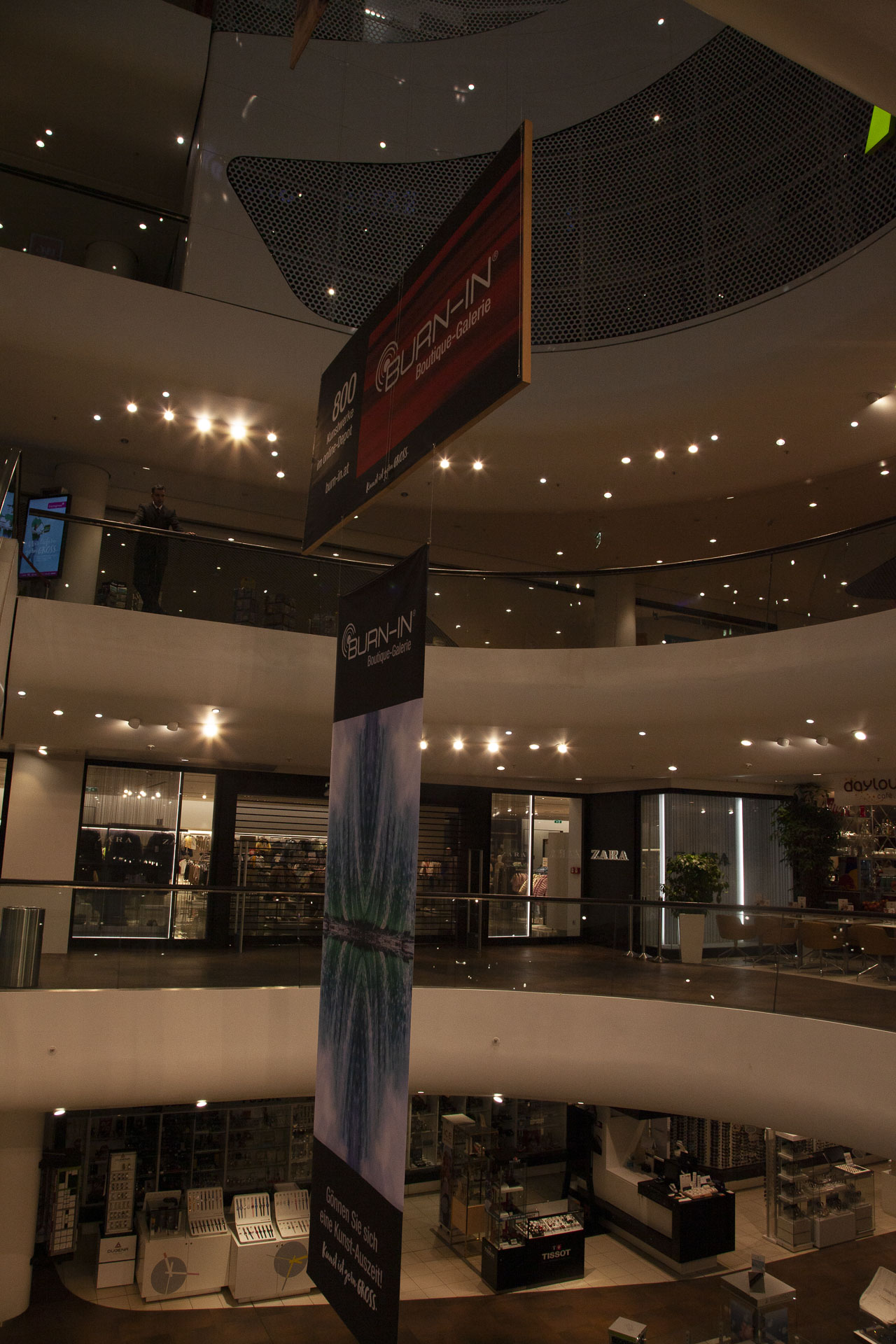 Kunstinstallation im Gerngross. Bereits im Februar inszeniert BURN-IN in imposanter Weise das Atrium und eine Schaufensterfläche direkt an der Mariahilfer Straße. Expressive Originale von Ladislav Černý, Aurora Cid und Ares Yannakopoulos schweben schwerelos im Luftraum und verwandeln den Einkaufstempel in einen Kunsttempel mit musealen Charakter.