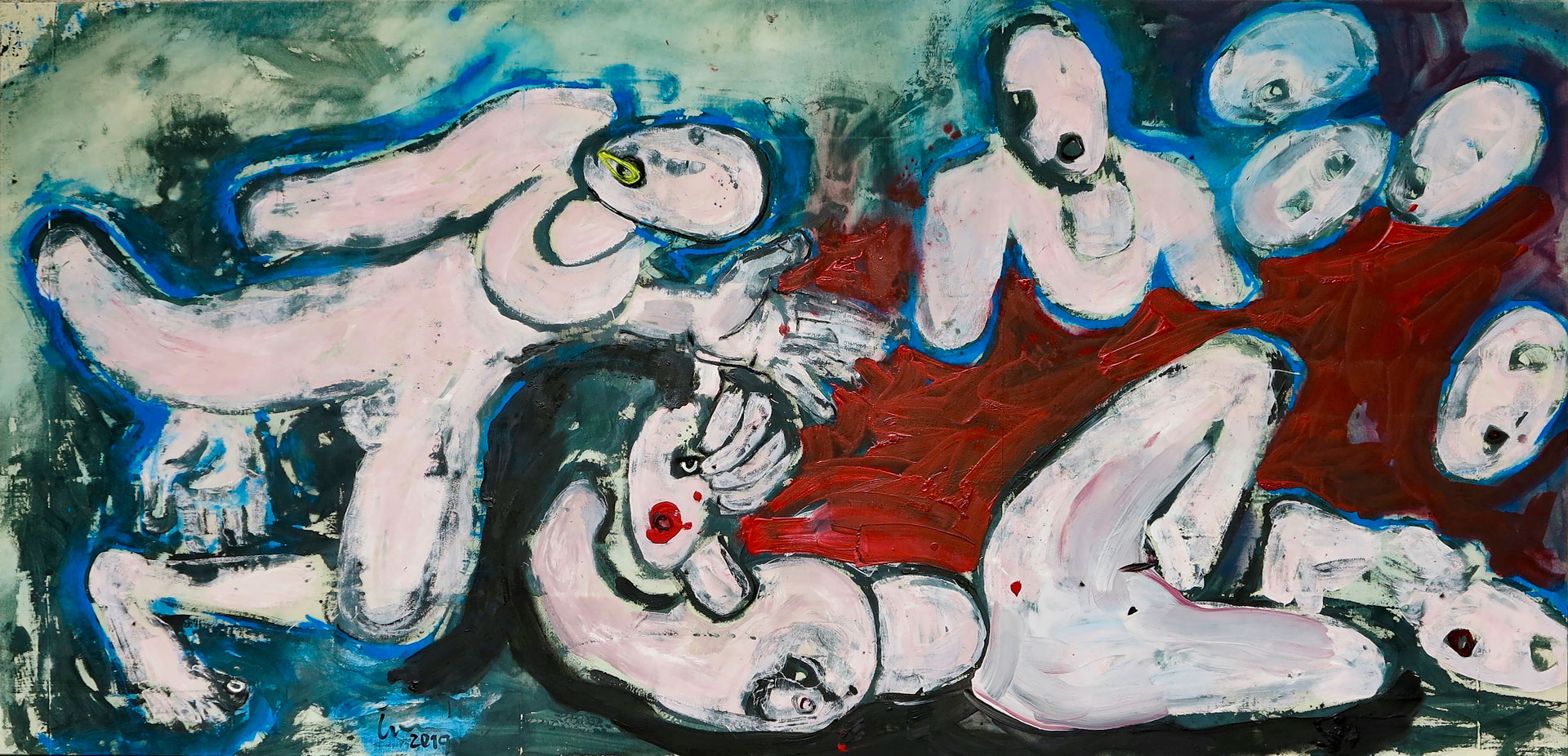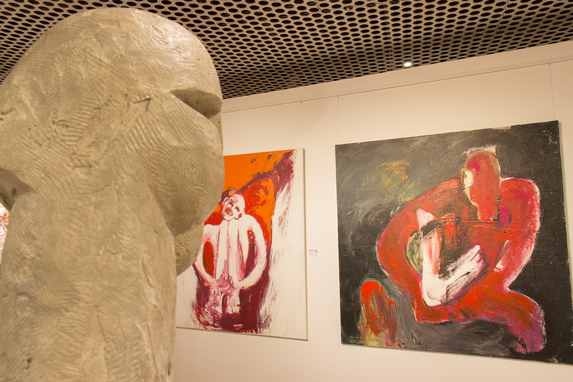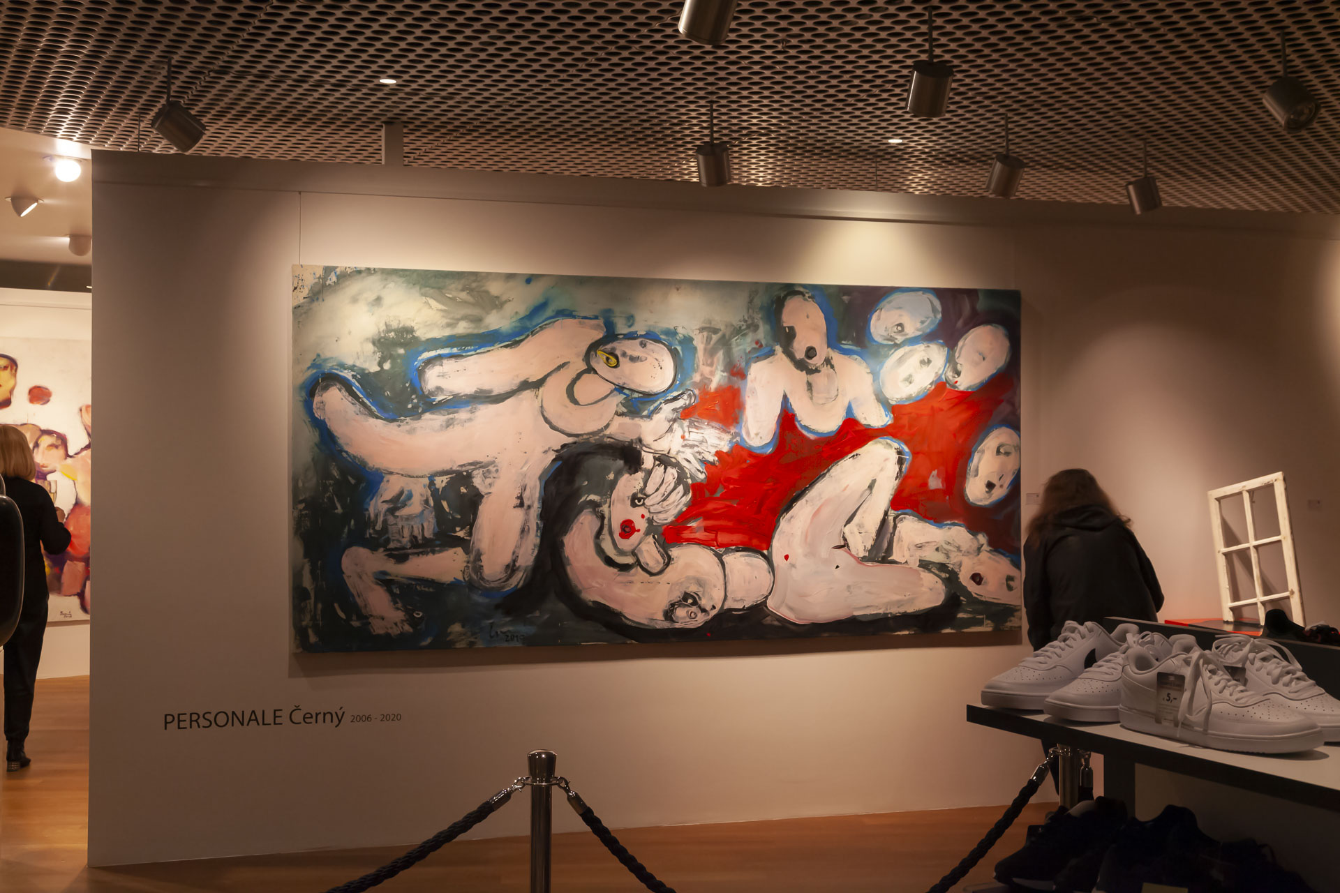 Die Mehrzahl der präsentierten Arbeiten stammt aus den letzten 3 Jahren, wo Černý eine enorme Schaffensphase an den Tag legte. Die Kernwerke, allesamt aus Acryl, Bad (2019 | 155 x 322 cm), Horizont (2019 | 210 x 200 cm) und der Schwimmer (2018 | 130 x 270 cm) überzeugen durch die große Expressivität und unvergleichliche Farbkomposition. Zartes, unschuldiges Rosa kontrastiert mit starken Blau-, Grau- und Rottönen. Das baut Spannung auf und lässt den Betrachter oftmals ins Grübeln kommen. Perfekt begleitet werden die Gemälde von den Skulpturen Flugzeuge in meinem Bauch (2017 | Linde, rosa polychromiert), Träumen (2017 | Bronze, Granit) und Flut (2013 | polychromierter Gips).