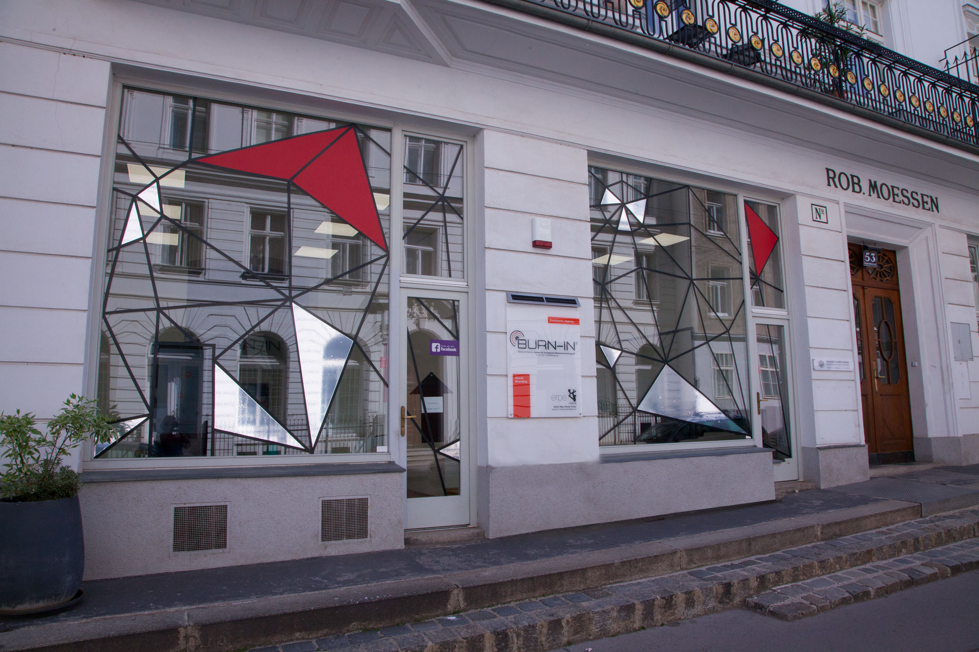 Künstlerisch setzt BURN-IN auf komplexe 3D-Visualisierungen und Animationen im Multi-Media Bereich und eine Polygon-ART Installation an den Hüllen der Galerie.