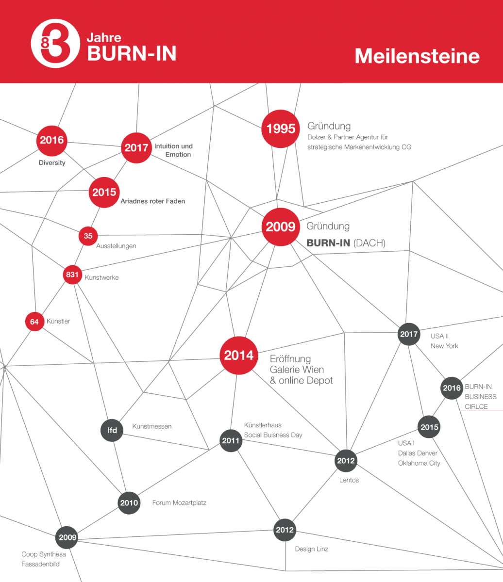 3 Jahre Galerie | Denkfabrik in Wien und 8 Jahre Marke BURN-IN inspirieren zu Höherem. BURN-IN entwickelt und stärkt Ihre Kreativität und überreicht Ihnen ein 3 tägiges Kreativcoaching mit 8 künstlerischen Impulsen von Warhol, Rainer, Uecker, Tàpies, Brandl, Damisch, Vopava oder Zitko.