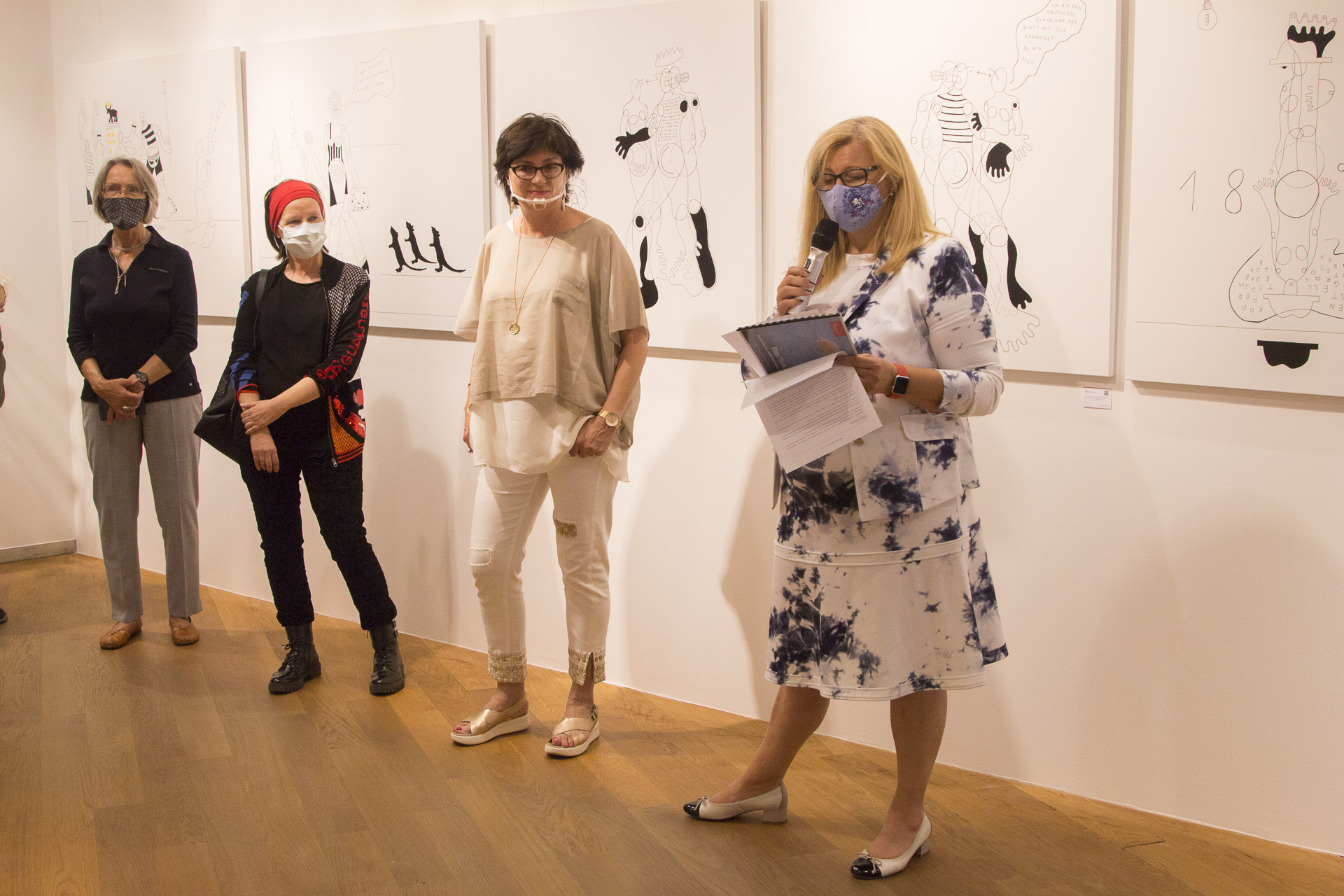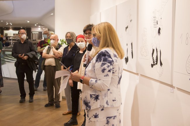 Petra Traxler-Pilgram zeigt mit ihren bewegten Figuren (Bezug nehmend auf den Wiener Kinetismus), dass Stillstand nicht nur furchterregend und beängstigend sein muss, sondern auch einen Anstoß zum Nachdenken und Innehalten liefern und vielfach enormes kreatives Potenzial freisetzen kann. Die Künstlerin nutzt dabei bewusst Klischees, Stereotypen und Vorurteile, um mit dem Betrachter auch auf einer Metaebene zu kommunizieren. Die multiplen Bildtitel akzentuieren die Bildinhalte, lenken die Assoziationen in unterschiedliche Richtungen, betonen die Mehrdimensionalität des Themas und verdeutlichen die Vielschichtigkeit der meist in Schwarz-Weiß gehaltenen Bildgeschichten. Drei Mehrfachtitel - quasi zum Aufwärmen, die es in sich haben: Elefantöse Zeiten, oder denk (nicht) an den rosa Elefanten | Melancholie oder Weltschmerz oder wer ist da von allen Geistern verlassen | Influencer oder Influenza? Gefährlicher Virus oder großer Käse.