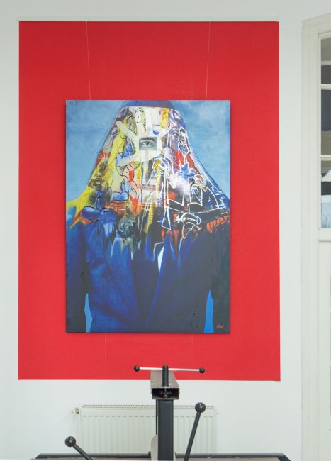 Background: betrachtet man das Labyrinth als Zeichnung, ist es eine Struktur, der Ariadnefaden der Weg durch die Struktur. Insofern wird ein innerer Weg (Gedanken und Gefühle) wie auch ein äußerer Weg durchschritten. Die Kehren des Labyrinths verwirren das logisch-geradlinige Denken, eine Absicht, die von den ausstellenden Kunstschaffenden verfolgt wird. Der Betrachter folgt den Gedanken des Künstlers indem er visuell einen Weg durch das Kunstwerk und seinen ganz individuellen Zugang findet.