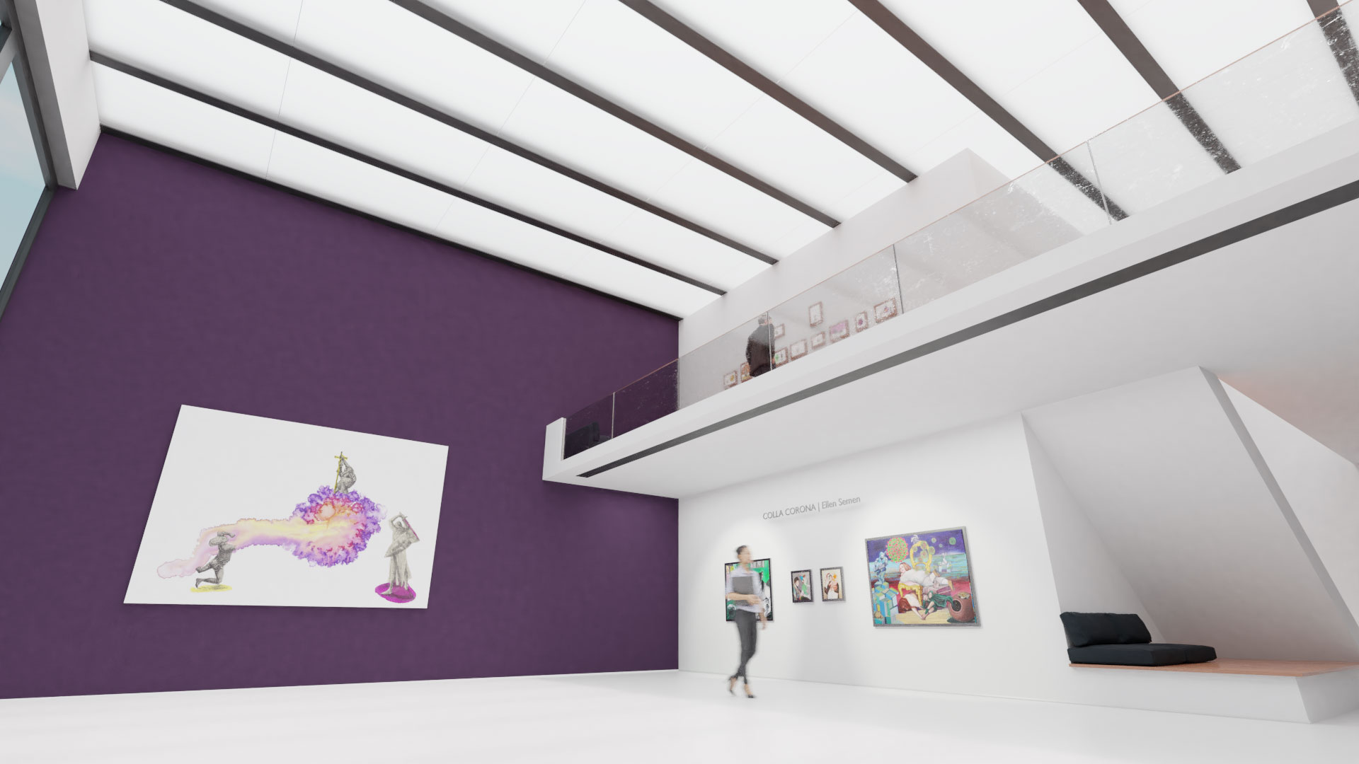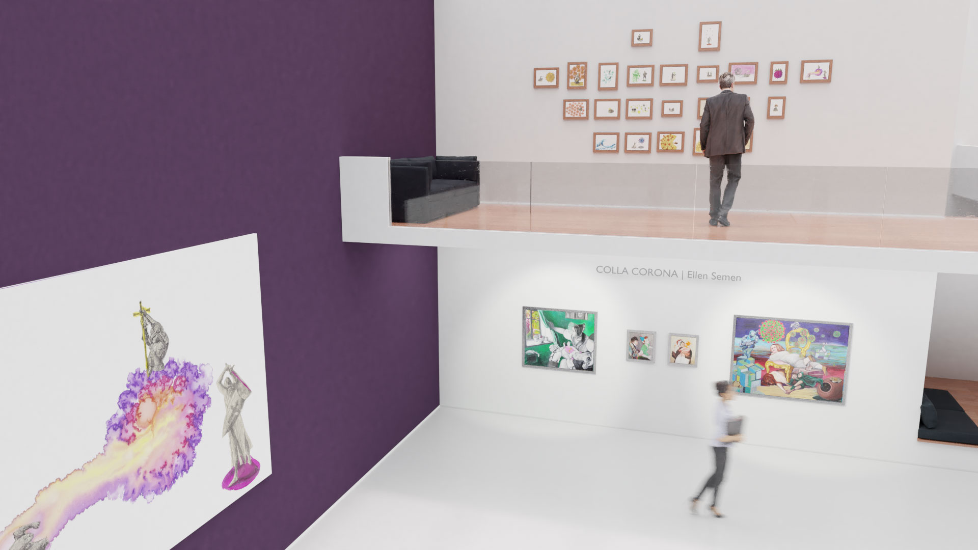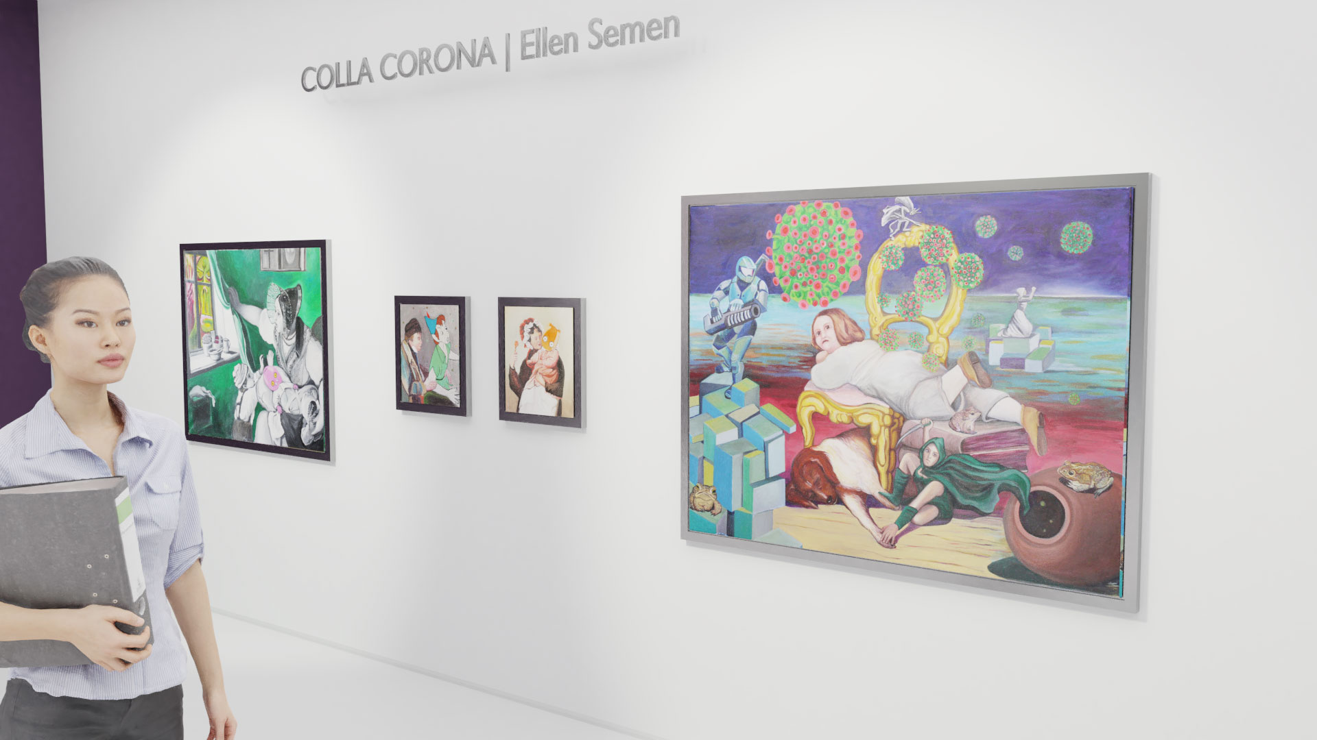 24 Kleinformate finden sich in Petersburger Hängung auf der oberen Ebene. Im Entree überzeugen vier Arbeiten in Öl auf Leinwand und als besonderes Highlight die beiden großformatigen Kunstdrucke Kampf gegen unbekannte Lebensform (2,4 x 3,5 m) und Die Berater (5 x 2,4 m) in FINE ART Masterprint Qualität. Semens COLLA CORONA Arbeiten überzeugen als berührende Zeitdokumente für das once in a lifetime Ereignis von Generationen.