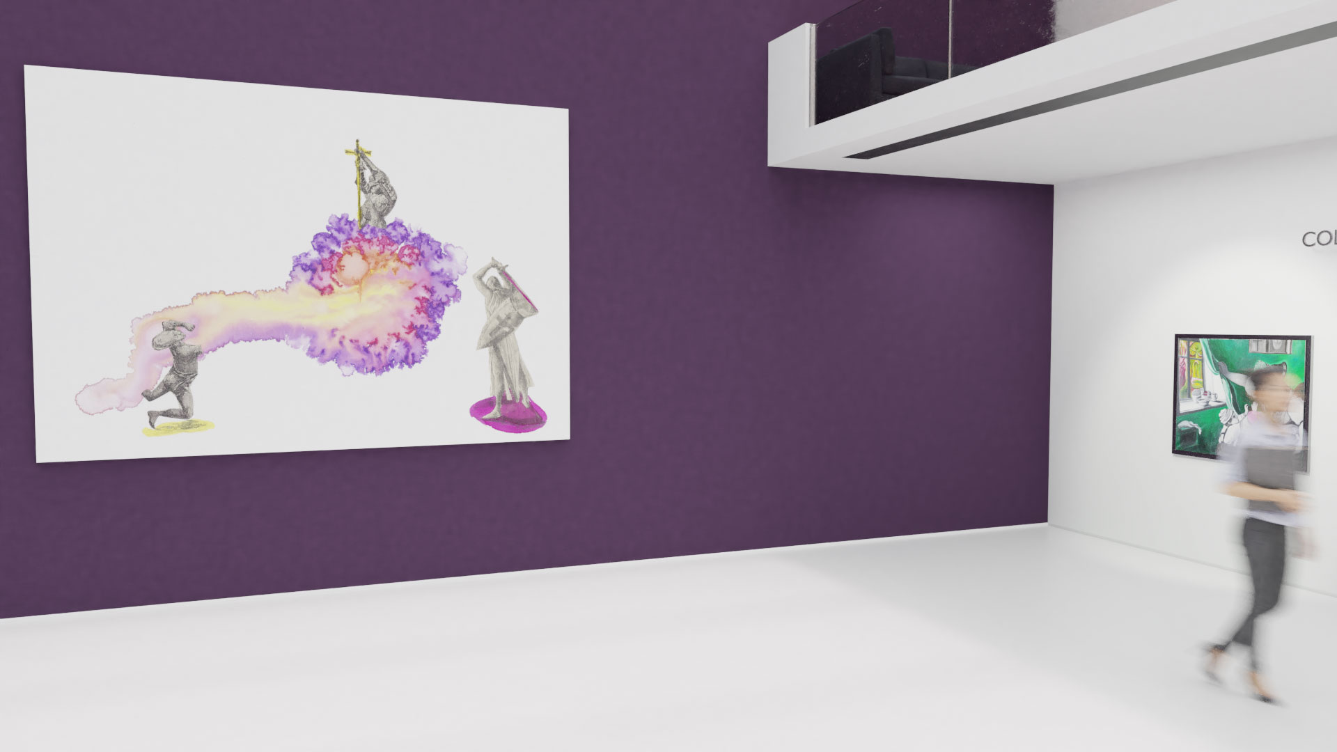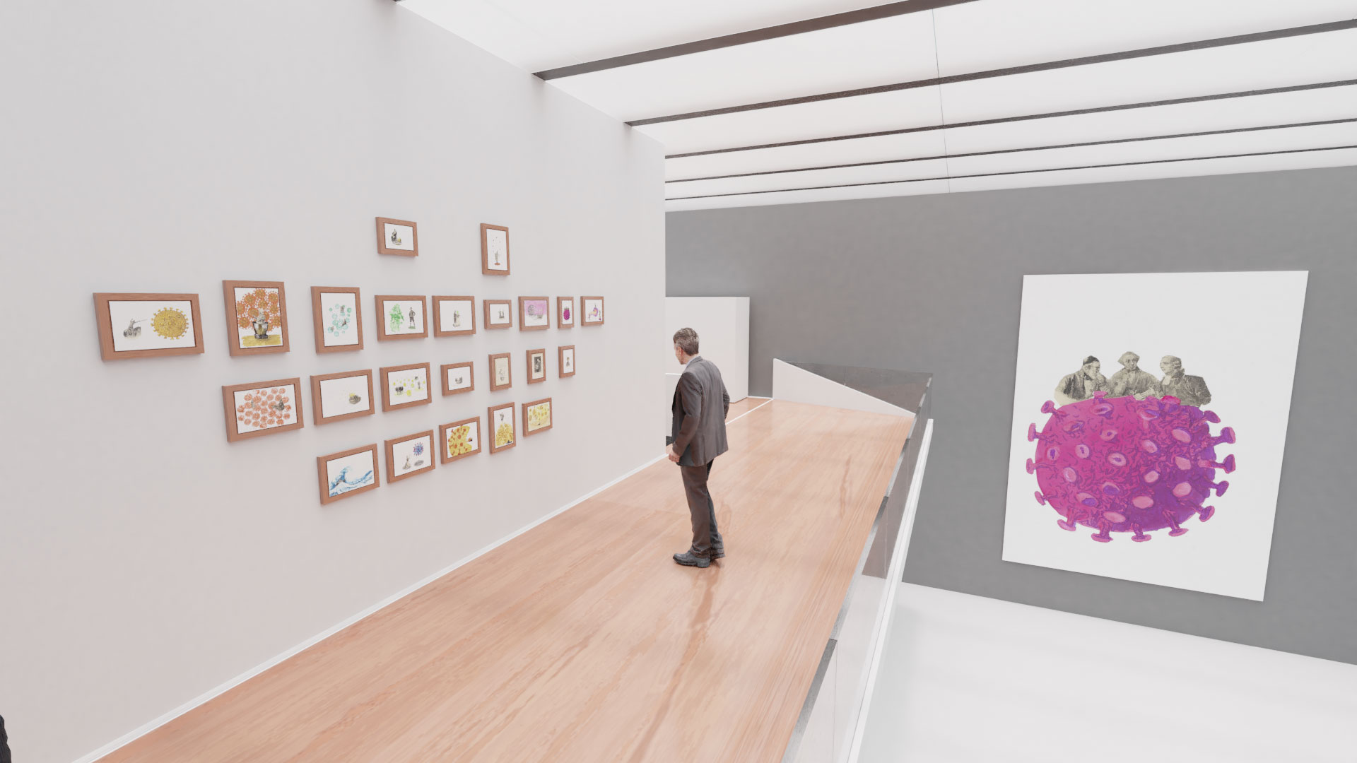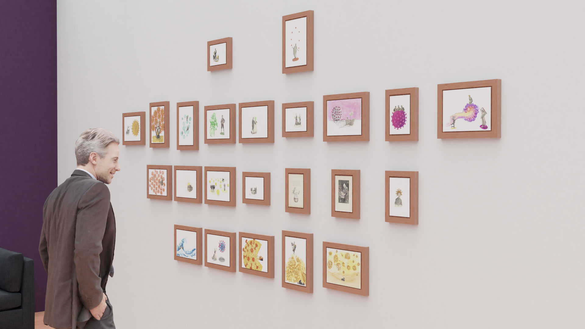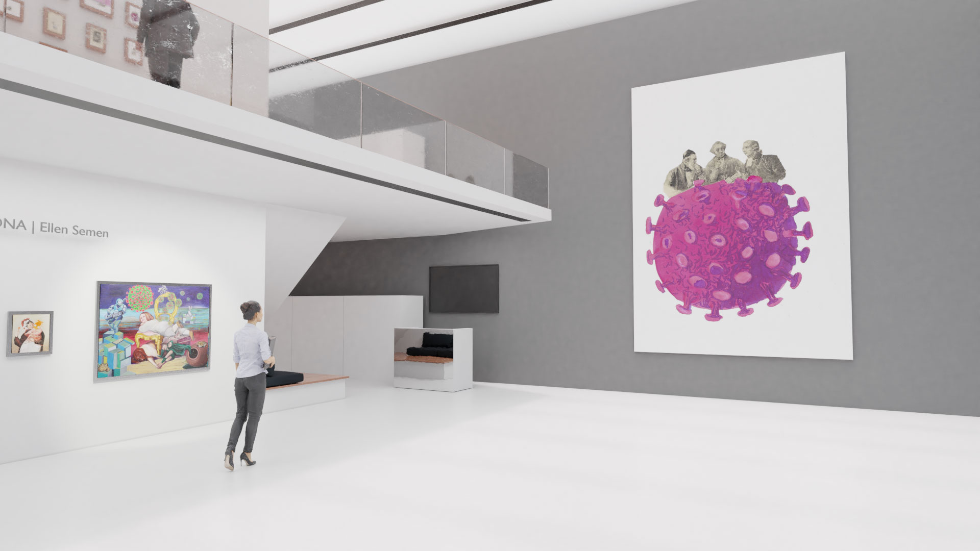 24 Kleinformate finden sich in Petersburger Hängung auf der oberen Ebene. Im Entree überzeugen vier Arbeiten in Öl auf Leinwand und als besonderes Highlight die beiden großformatigen Kunstdrucke Kampf gegen unbekannte Lebensform (2,4 x 3,5 m) und Die Berater (5 x 2,4 m) in FINE ART Masterprint Qualität. Semens COLLA CORONA Arbeiten überzeugen als berührende Zeitdokumente für das once in a lifetime Ereignis von Generationen.
