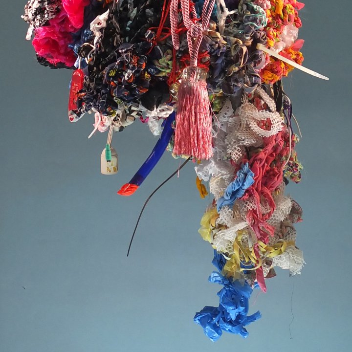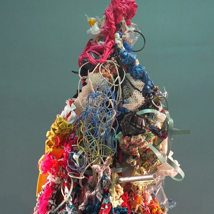Secondhand Textilien in Bänder geschnitten, verhäkelt mit: kaputten Ladekabeln, Kopfhöhrern Stromkabeln;  Plastikverpackungen die im Haushalt anfallen: Obst- oder Gemüsetassen oder -netze, Verpackung von Kaffee, Taschentüchern etc. Übriggebliebene Gegenstände aus Kunststoff. Kunststoffverpackungsbänder bei Baustellen oder auf der Straße gefunden.....