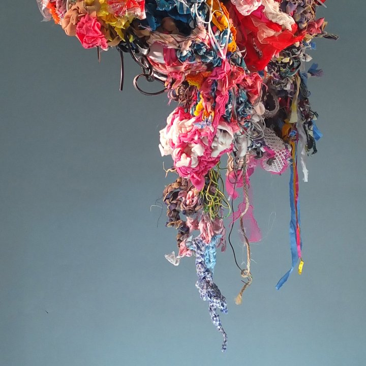 Secondhand Textilien in Bänder geschnitten, verhäkelt mit: kaputten Ladekabeln, Kopfhöhrern Stromkabeln; Plastikverpackungen die im Haushalt anfallen: Obst- oder Gemüsetassen oder -netze, Verpackung von Kaffee, Taschentüchern etc. Übriggebliebene Gegenstände aus Kunststoff. Kunststoffverpackungsbänder bei Baustellen oder auf der Straße gefunden.....